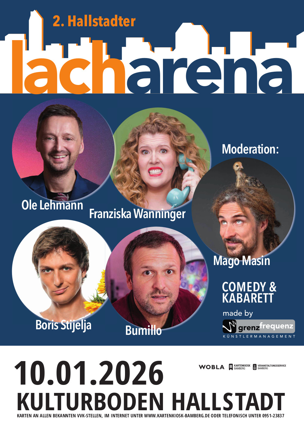 Am 10. Januar 2026 wird wieder gelacht in Hallstadt! Es wartet erneut ein fantastischer Mix aus Kabarett und Comedy auf Sie!