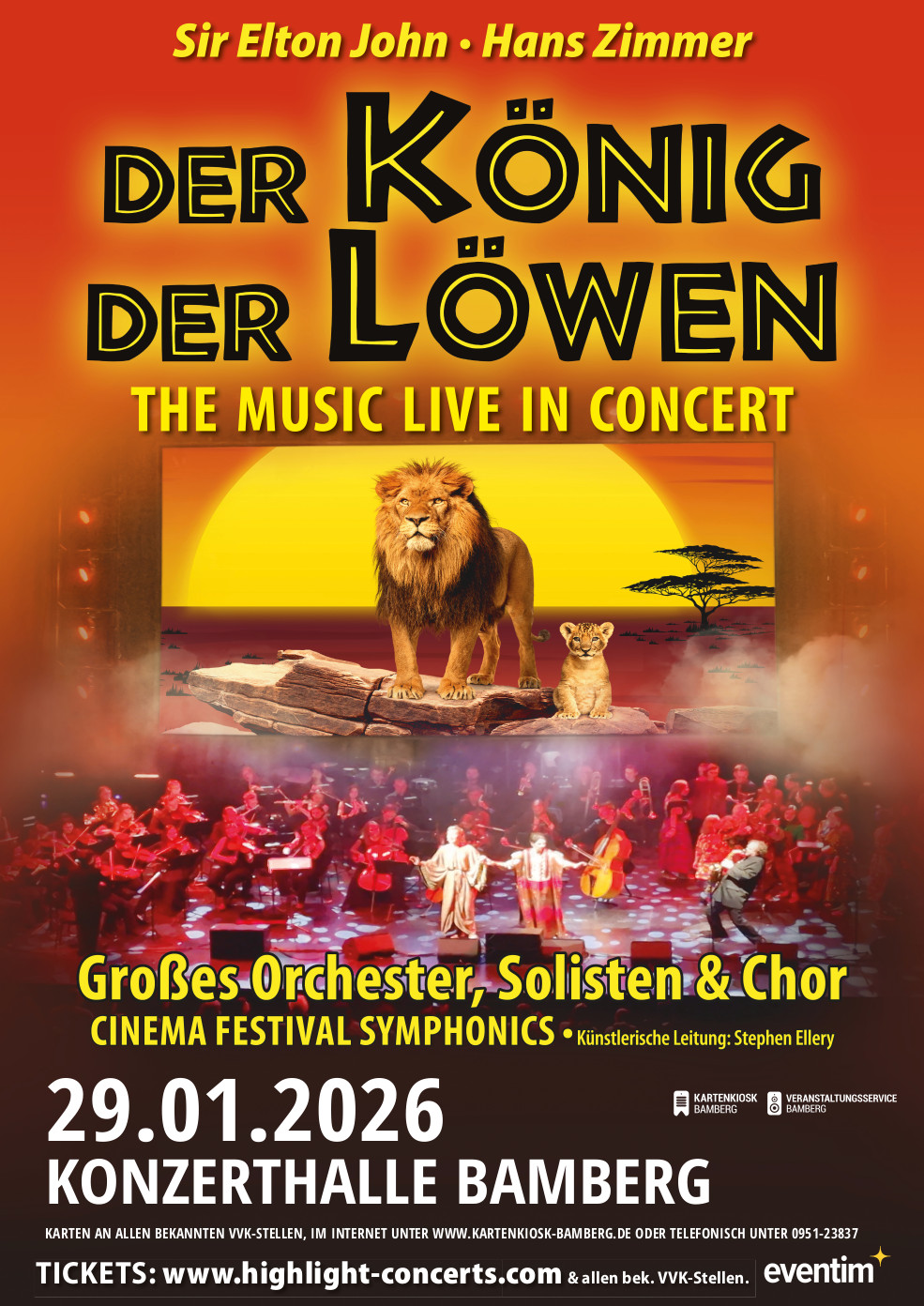 Die magische Musik von Sir Elton John und Hans Zimmer zusammen in einem einzigartigen Konzerterlebnis, mit Orchester, Solisten, Chor und Leinwand Animationen, das berührt und begeistert! Das ist Der König der Löwen – The Music live in Concert.