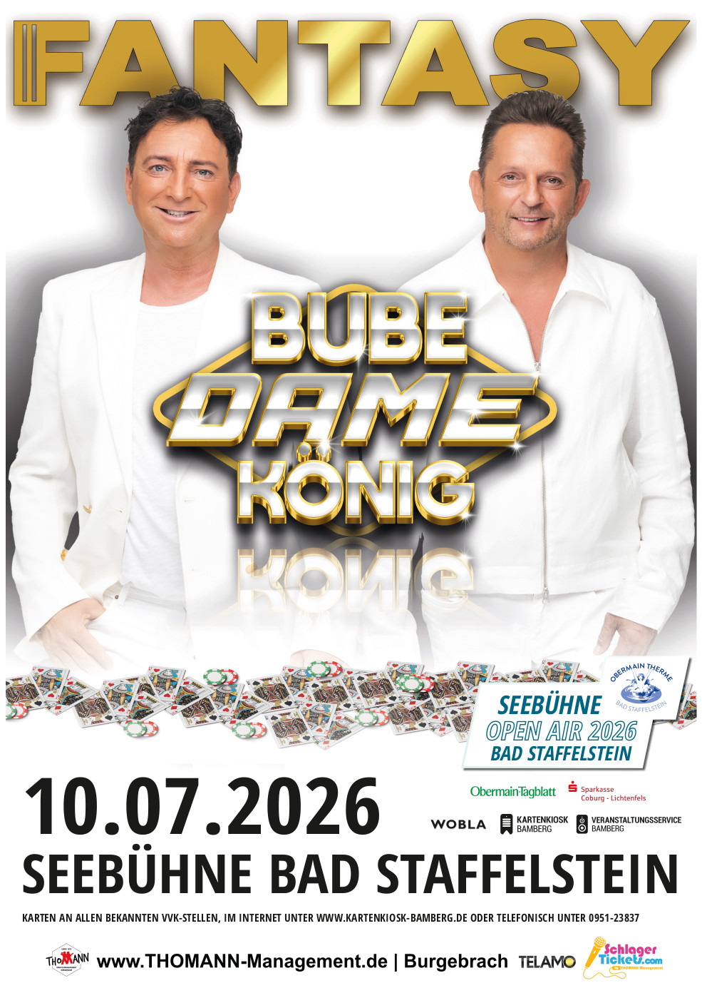 Mit neuen Songs aus ihrem gleichnamigen Album „Bube Dame König“ (VÖ: März 2026), aber auch mit ihren größten Hits, zieht es Fredi und Martin auch in 2026 wieder durch Deutschlands Hallen. Es darf gelacht, geschunkelt, getanzt, geklatscht, gekuschelt, aber auch geweint werden. Denn wer einmal in einem Fantasy-Konzert war weiß, dass für jeden das Passende dabei ist. Gemeinsam mit ihren Fans wollen die Zwei ihr neues Album feiern und einen unbeschwerten Abend, weil weg von den Alltagssorgen, genießen. Kommt vorbei!