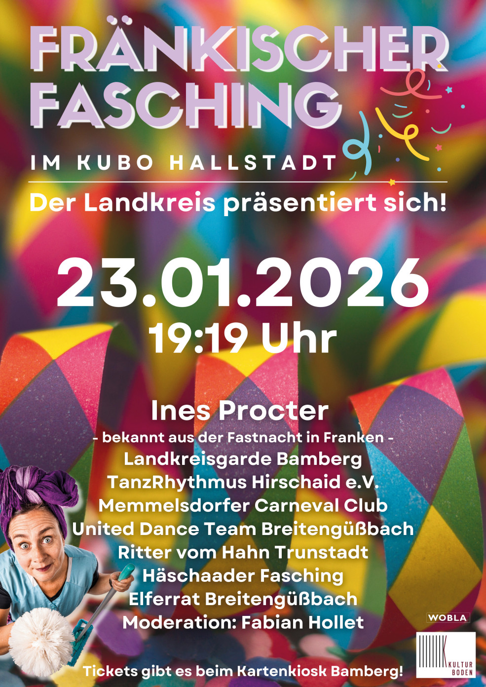 Doch das ist nur der Auftakt eines Abends voller Highlights. Als besonderes Glanzlicht steht ein Star der fränkischen Fastnacht auf der Bühne: Ines Procter – die „Putzfraa“. Mit ihrem unverwechselbaren Humor, Charme und spitzer Zunge bringt sie das Publikum garantiert zum Lachen. Neben ihr stehen noch viele weitere Künstler:innen auf der Bühne: Noah Metzger vom TanzRhythmus Hirschaid begeistert als junger Büttenredner. Bereits im Bayerischen Rundfunk in der Sendung Fastnacht in Franken – Jung und närrisch gefeiert, nimmt er das Publikum diesmal mit auf seine witzig-ironischen Freizeiterlebnisse. Aus Trunstadt sorgt das Musik-Unikum Michael Kratzer mit seiner Gitarre und Liedern im Stil eines bekannten bayerischen Liedermachers für Gänsehaut und gute Laune, der Memmelsdorfer Carnevals Club (MCC) bringt das lokale Geschehen in die Bütt – pointiert, unterhaltsam und mit viel Nähe zu Stadt und Landkreis und der Elferrat Breitengüßbach schickt mit Anna Guttila eine bereits überregional bekannte Büttenrednerin auf die Bühne, die ihre Karriere schon mit zahlreichen TV-Auftritten krönen konnte. Mit perfektem Tanz und aktuellen Themen sorgt das United Dance Team Breitengüßbach für staunende Augen und begeisterte Stimmung und bietet Schautanz auf höchstem Leistungsniveau. Pure Lebensfreude verspricht der Häschaader Fasching e.V. mit einer bunten Bühnenshow voller Musik, bei der Mitmachen ausdrücklich erwünscht ist, denn Fasching bedeutet: mitsingen, mittanzen, lachen und pure Lebensfreude. Der Kulturboden Hallstadt wird am 23. Januar 2026 zum Treffpunkt aller, die den fränkischen Fasching lieben und gemeinsam feiern wollen. Ein Abend voller Emotionen, Unterhaltung und gelebter Faschingstradition – unbedingt vormerken und dabei sein!