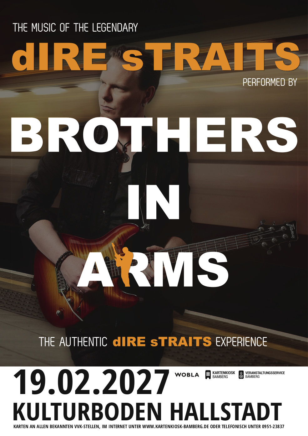 Über 40 Jahre Dire Straits und eine Bühnenabstinenz seit rund 30 Jahren gaben Anlass, den musikalischen Waffenbrüdern eine Art Renaissance zu verpassen. So war es naheliegend, dass sich für die im Jahr 2002 gegründete Formation “Brothers in Arms” eine Handvoll auserwählter Musiker fand, die es nicht nur verstehen, die Hits sondern auch den Geist und die Atmosphäre von dIRE sTRAITS live zu reproduzieren. Seit nunmehr 19 Jahren gehören „Brothers in Arms“ zu den erfolgreichsten Tribute Bands im Lande und das mit einer von Jahr zu Jahr wachsenden Fangemeinde und weit über die Grenzen Deutschlands hinaus.