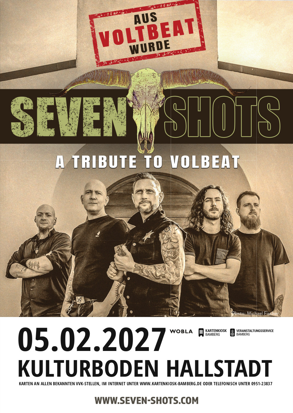Perfekter Gitarrensound, tiefe Bässe, ein druckvoller Drum-Sound und eine markante, durchdringende Stimme – dafür steht Seven Shots, Europas erfolgreichste Volbeat-Tribute-Band.