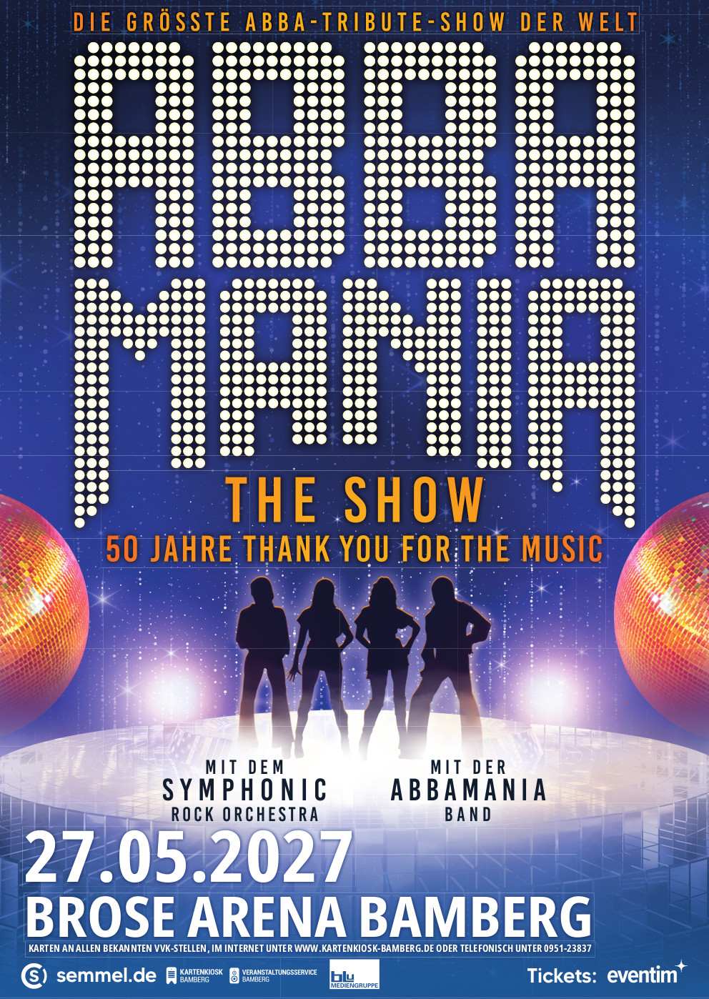 Auch 2027 heißt es bei ABBAMANIA THE SHOW: Mitsingen, Tanzen und gemeinsam die Faszination von ABBA erleben. Zusammen mit dem Symphonic Rock Orchestra, der ABBAMANIA-Band sowie herausragenden Sängerinnen und Sängern wird die unverwechselbare Atmosphäre der 1970er- und 80er-Jahre eindrucksvoll lebendig. Originalgetreue Kostüme, mitreißende Performances und eine spektakuläre Licht- und Bühnenshow schaffen den perfekten Rahmen, um die Musik von ABBA nicht nur zu hören, sondern gemeinsam zu feiern.