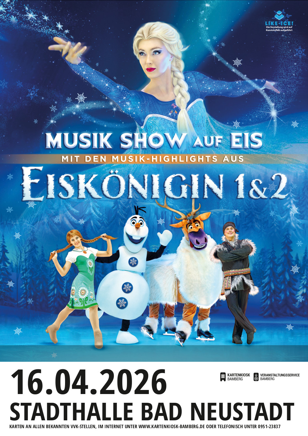LIKE-ICE! - Jeder live gesungene Song begeistert in spektakulärer Form – auf Eis! Diese nachhaltige künstliche Eisfläche, genannt LIKE-ICE! erlaubt es den Darstellern, den Zauber von Eiskönigin 1&2 ohne den ökologischen Fußabdruck einer natürlichen Eisbahn zu entfalten.