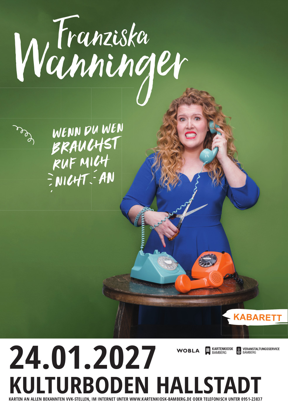 Die Telefonleitungen glühen, denn Franziska Wanninger bringt nach ihrem Erfolgsabend „Für mich soll’s rote Rosen hageln“ ein neues Kabarettprogramm raus! „Wenn du wen brauchst, ruf mich nicht an“ ist eine kurzweilige Melange von erfrischender Ehrlichkeit. Denn wer gibt schon gern zu, dass die eigenen Ratschläge öfter mal nach hinten los gehen. Schließlich sind alle Paare, bei denen die preisgekrönte Kabarettistin Trauzeugin war, längst wieder geschieden.