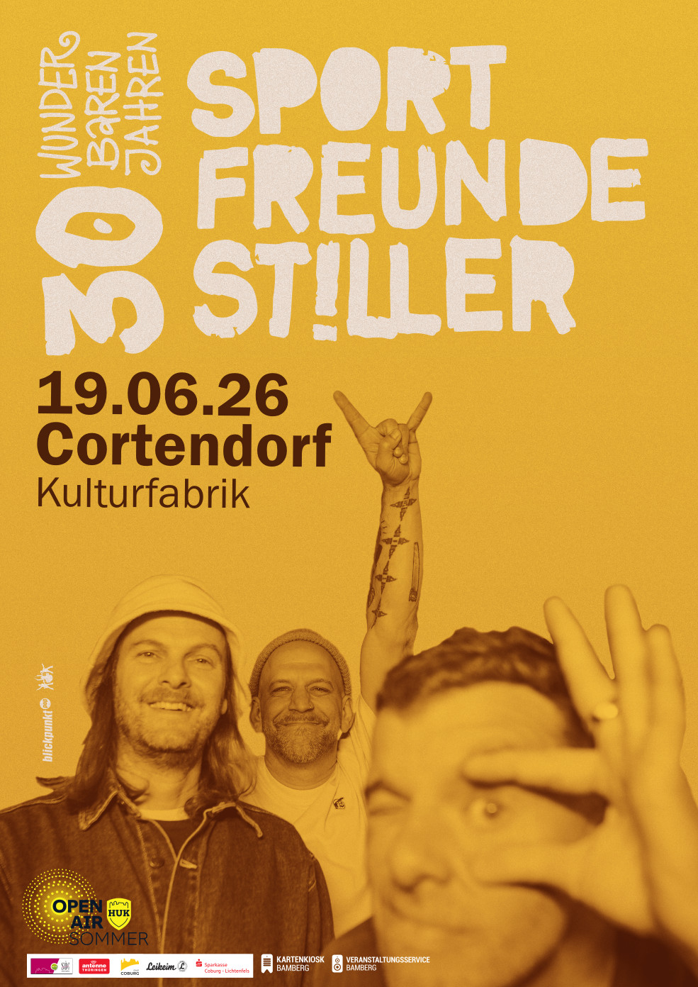 Und Lieder als Freunde und Freunde als ewige Begleiter unserer Lieder. Immer und immer wieder… Es ist 2026….nun also feiern wir Sportfreunde 30jähriges Jubiläum. Das muss man sich mal aufm Drumfell zergehen lassen! Als Mensch bedeutet die 30, Jugend ade, Real Life ohje! Als Band bedeutet die 30, Hurra, wir leben noch! (Frei nach Milva) Und dass diese Band nun schon so lange unser Leben begleitet, ja, in bedeutsamer und positivster Weise prägt und inspiriert, wollen wir mit euch feiern!