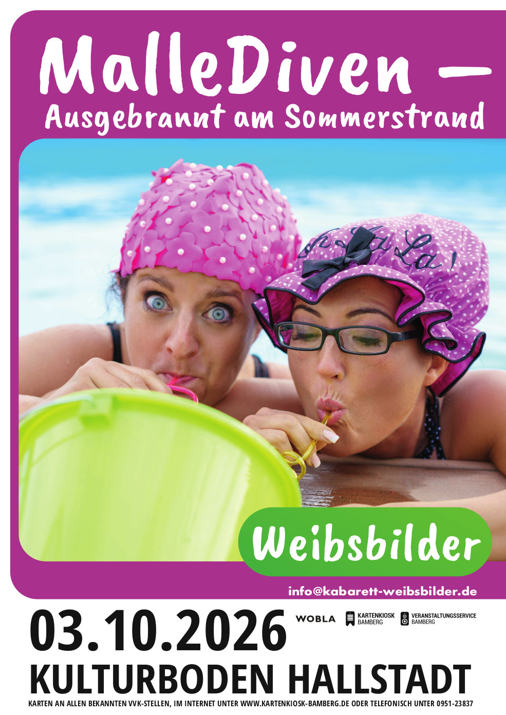 Kaum ein Thema spaltet die Geschmäcker so sehr, wie die jährlich wiederkehrende arbeitsfreie Zeit. Wo geht’s hin und was muss mit? Da die Damen des Kabarett- und Comedyduos Weibsbilder noch immer unbemannt durchs Leben laufen müssen, wollen sie diesmal ihr Glück bei einer Single-Kreuzfahrt suchen, um in hoffentlich ruhigen Gewässern im Ehehafen anzulegen. Was sie dort erleben oder eben nicht, erfahren Sie in ihrem neuen 2- stündigen Programm.