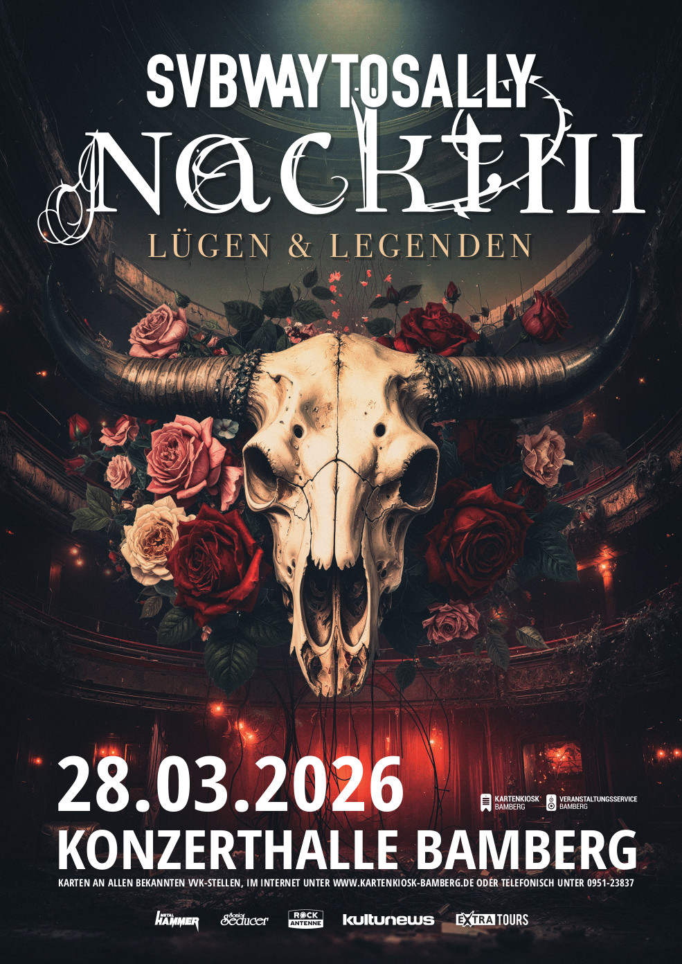 2006 begann dieses Kapitel, 2010 wurde es mit NACKT II fortgeschrieben – nun ist die Zeit reif für eine neue Runde, denn aller guten Dinge sind nackt drei: 2026 kehrt die Potsdamer Band mit NACKT III – Lügen & Legenden zurück auf die Akustik-Bühnen und taucht dabei tief in die eigene Geschichte ein. Wehmütig, durchgeknallt, verspielt und virtuos – SUBWAY TO SALLY zeigen sich einmal mehr von einer anderen Seite.