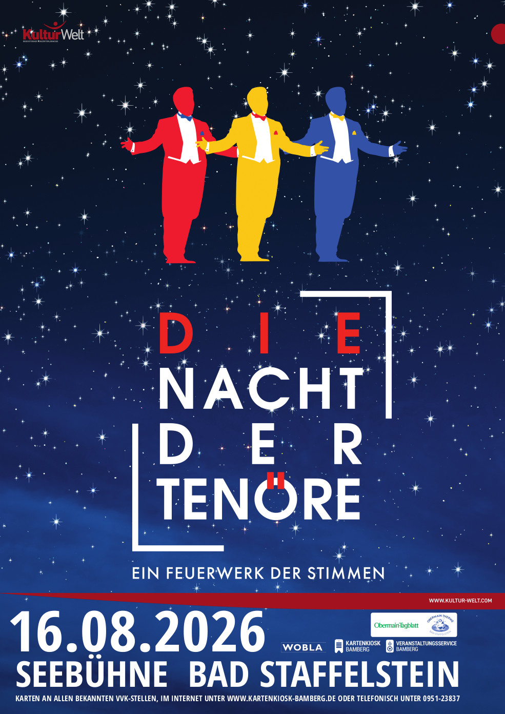 Die „Nacht der Tenöre“ kommt wieder nach Bad Staffelstein. Nach dem Erfolg im Sommer 24 machen die 3 Tenöre wieder Station auf der Seebühne. Das kurzweilige Programm reicht von Arien aus bekannten Opern und Operetten über beliebte Canzone. Kurz: Ein großartiger Abend mit drei herausragenden Stimmen!