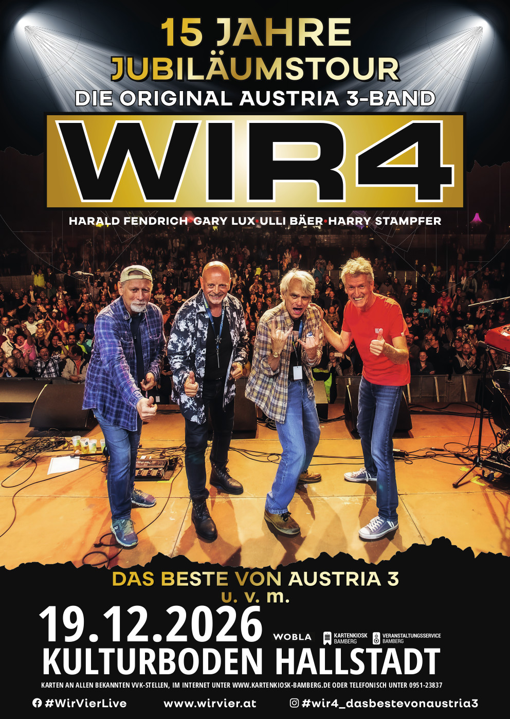 2026 wird ein besonderes Jahr für alle Fans österreichischer Musik: WIR4 lädt zur großen 15-Jahre-Jubiläumsshow. Ein mitreißendes Konzert, das das Beste aus zwei Welten vereint: unvergessene Hits von Austria 3, eigene Songs mit Charakter und Tiefgang sowie internationale Covers in wienerischen Übersetzungen. Den roten Faden bilden die humorvollen und hintergründigen Moderationen, die längst zum Markenzeichen von WIR4 geworden sind.