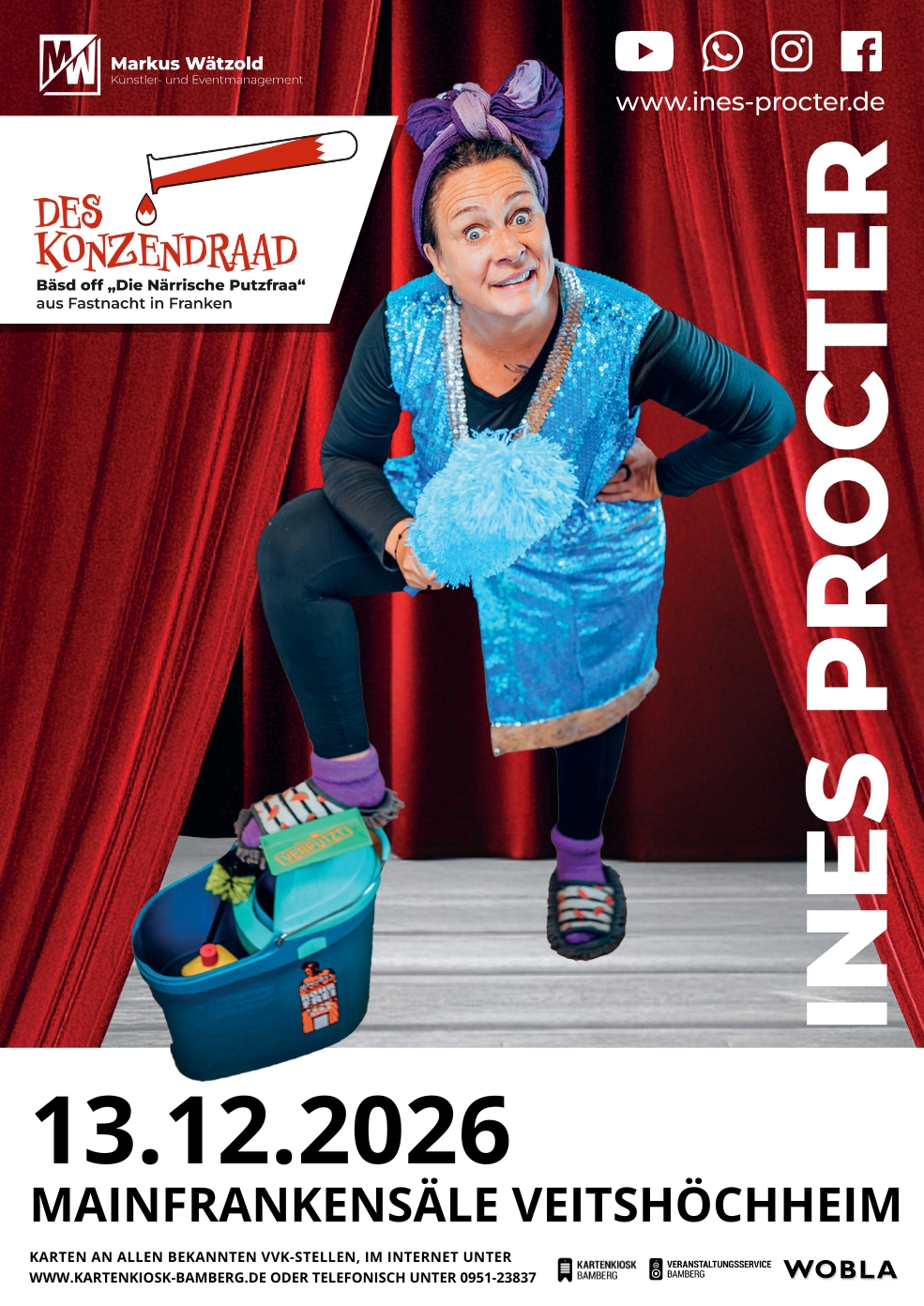 2026 ist es so weit: Eine exklusive Tour mit den besten Nummern aus zehn Jahren Fastnacht! 90 Minuten am Stück wischt, schrubbt und poliert die Putzfraa eure Lachmuskeln und Gehirnwindungen – selbstverständlich in den originalen Bühnen-Outfits aus den jeweiligen Livesendungen des BR-Quotenrenners Fastnacht in Franken.